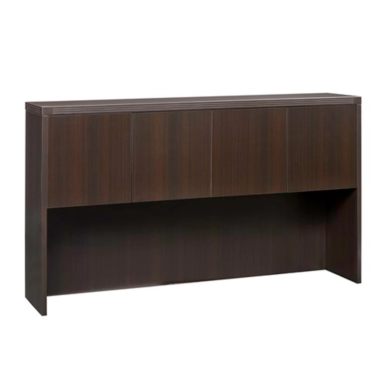 - Stack-on hutch features four cabinet styled doors with self-closing hinges or textured, tempered glass