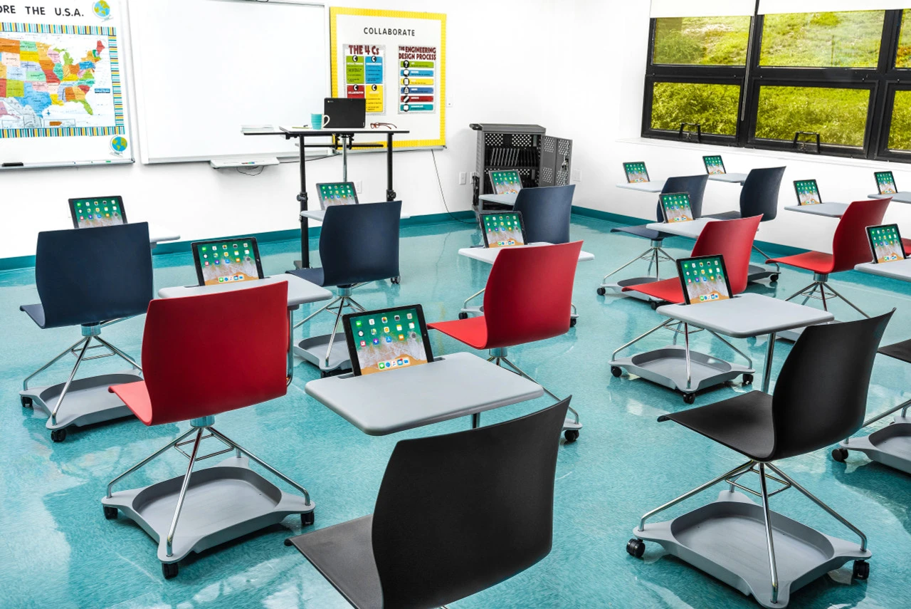 National Public Seating produces no-fail furniture and equipment that stands the test of time. The Chair-On-The-Go is a rolling swivel chair with a tablet arm. It has a fiberglass-reinforced polypropylene seat with a waterfall edge that offers a flex-stretch feature for long study days. The seat on this tablet arm chair swivels and the dual casters allow easy movement and adaptability. The smooth poly-reinforced extra-wide tablet arm on this chair has a slot to hold computer tablets or laptops. To top off the quality of this chair, it meets MAS-Certified Green and ANSI/BIFMA standards.