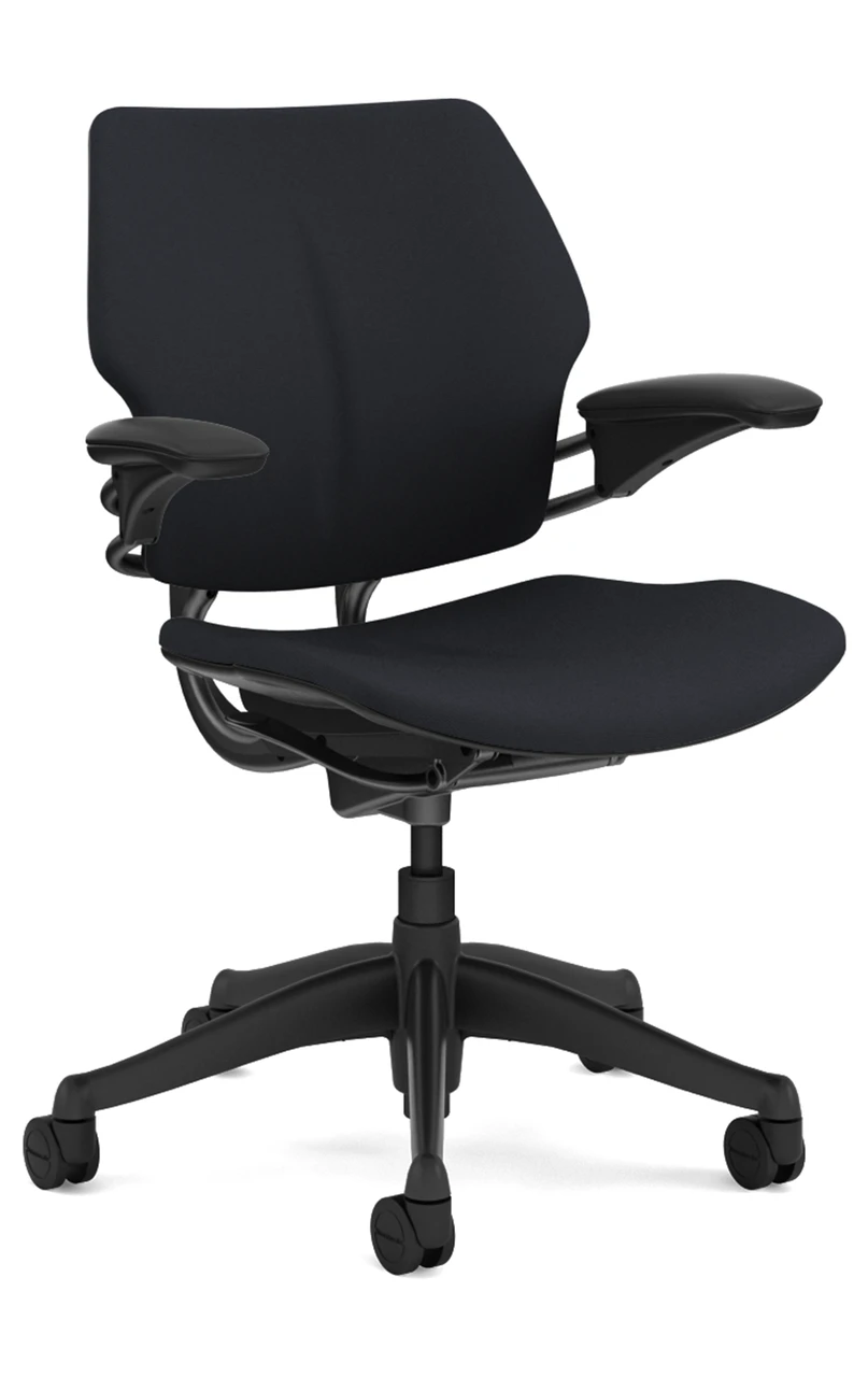 Described by The New York Times as “the gold standard in office seating”, the Humanscale Freedom chair redefines the concept of ergonomic seating. Designer Niels Diffrient designed an office chair that automatically adapts to the users frame and weight, allowing them to move freely. Diffrient’s unique approach removed the complexities found in other chairs, such as awkward recline levers and back tension dials, for a truly ergonomic chair. As a result, he developed a recline mechanism that perfectly adjusts to the user, definitively reinventing modern task seating. Nothing to fuss with, adjust the height and just sit back and enjoy. This Humanscale Freedom task chair is configured in the most popular colors and specifications. OfficeChairs USA can send you complimentary textile samples or can configure this chair to your specifications with a simple email or phone call.