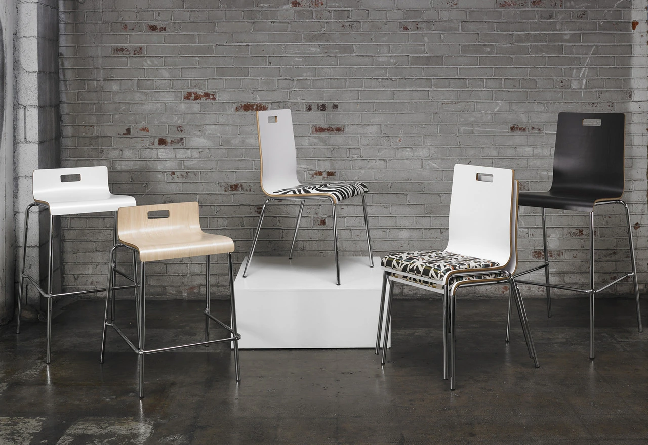 The Jive Counter Height Stool is a clean shell model, with a counter height seat ideal for cafeterias, break rooms, auditoriums, or seminars. The attractive bent plywood shell has a laminate finish maximum durability & easy maintenance. *An order of more than a dozen chairs may increase lead time to 2-3 weeks!