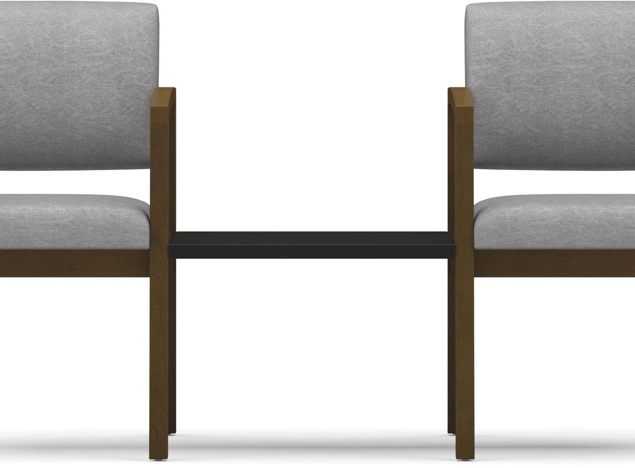The Lenox Black Laminate Connecting Center Table by Lesro is part of a series of reception furniture that offers unique customization to fit into any reception area. This product allows a table top to be placed in between two Lenox series reception chairs. The table is made out of solid hardwood with a black melamine scratch-resistant finish. Another version of this table is offered with a solid hardwood finish instead of a black laminate finish.