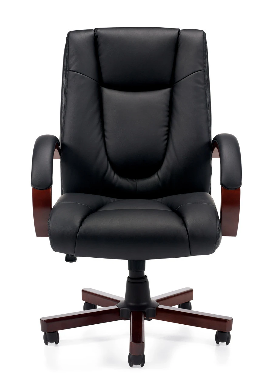 This OTG executive swivel tilt chair has accented Cordovan Mahogany wood trim on the arm supports and the base. The arm height on this tasker, works best for taller framed sitters. This chair is upholstered in Globals Luxhide leather which is a hybrid leather material that yields a very smooth hand and great surface consistency. Easy to clean and it breathes! This chair carries the OTG by Global factory warranty (click on the tab below).