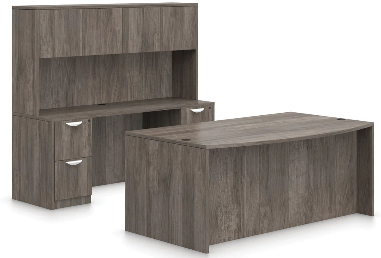 Value, value, and more value best describe the OTG SL-I Executive Bow-Front Desk Suite from our friends at Global. OTG gives you full extension, locking drawer pedestals, laminate finishes, and easy-to-assemble desk shells. (Pedestals arrive assembled). Metal pins and industry-approved cam fasteners make the desk shell assembly a snap. Grommets come standard on all desks and returns. The pedestals feature top-quality full-extension ball-bearing slides on all drawers while the 3mm matching ‘Super Edges’ protects your tops from chairs. Strong OTG factory warranty.
