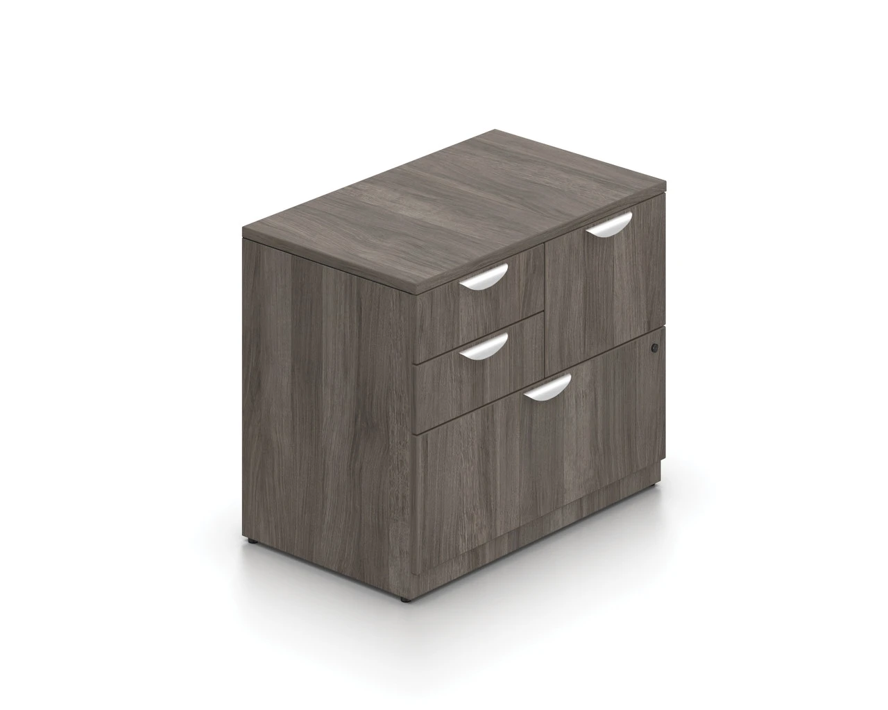 This mixed filing and storage unit compliments the OTG Superior desk line. Unit serves as both a lateral file along plus has one letter sized file drawer and two personal storage drawers. Top quality full extension ball bearing slides on all drawers. 3 mm matching ‘Super Edges’ provides your tops with protection from chairs. Strong OTG factory warranty.