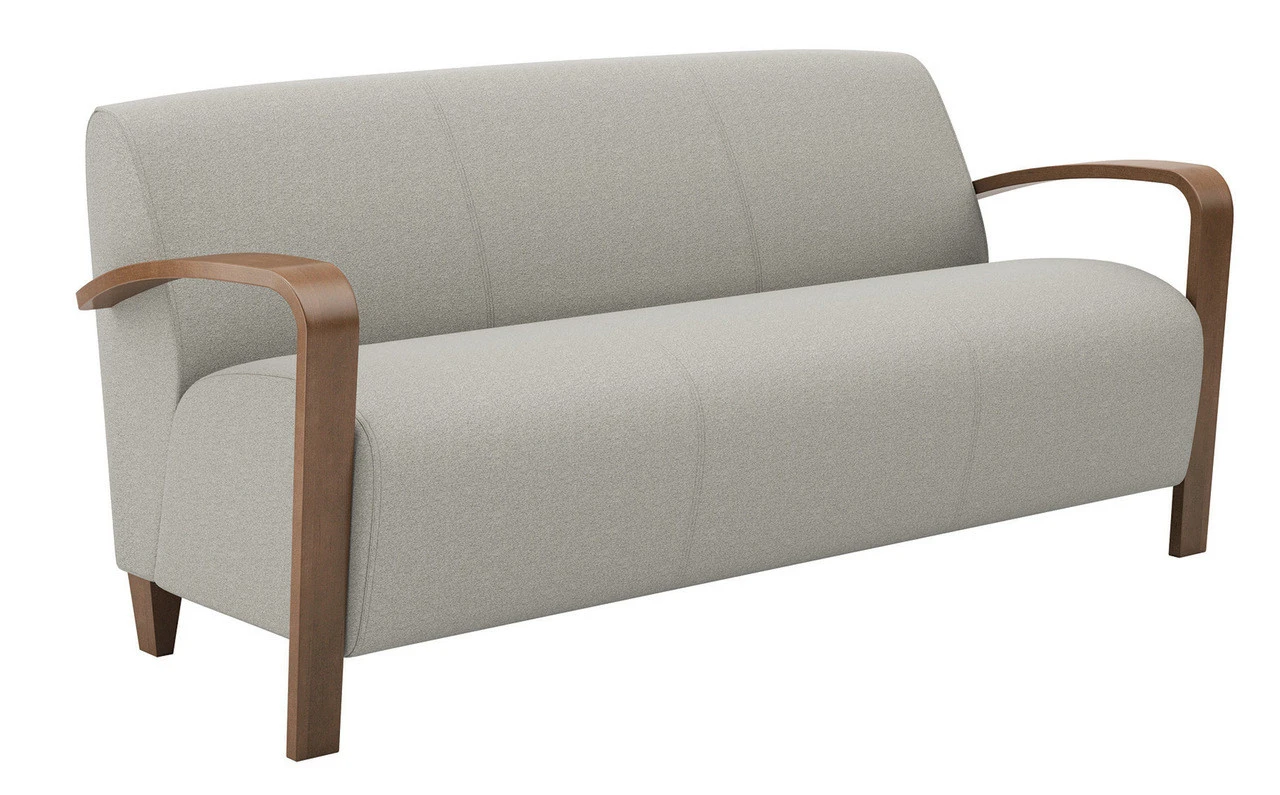 The Reno Three Seater Sofa with Wood Arms & Legs is plush comfort through and through. Thick polyurethane foam and support webbing make this lounge chair a treat to sit in. Wood legs and arms in 8 finishes. See our fabric selector above to choose upholstery. This three seater sofa has wood arms that match your choice of wood finish for the legs, instead of the fully upholstered arms on the Reno 3 Seat Sofa. *Ships free to commercial addresses with loading dock, otherwise fees apply. Does NOT ship to a residential address.