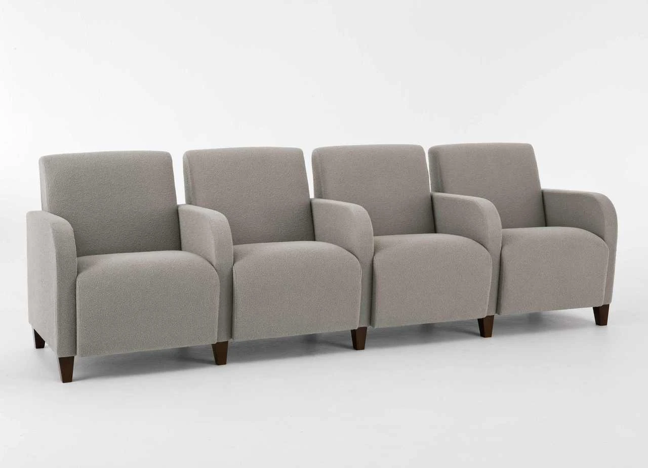 The Siena Four Seat Sofa with Center Arms by Lesro comes fully upholstered and is built with a heavy duty construction to meet the needs of a high-use reception area. The sofa is offered in over 200 different fabrics and vinyls and the legs can be customized in 9 wood finishes or a brushed stainless steel finish. The sofa features the Lesro Matrex seat support system for comfort throughout the life of this product and rounded arms for additional comfort. Three fully upholstered center arms are featured on this sofa, each placed in between two seats. This item is shipped in several pieces and is assembled in a few easy steps shown in the assembly guides below. Minimal Assembly Required.