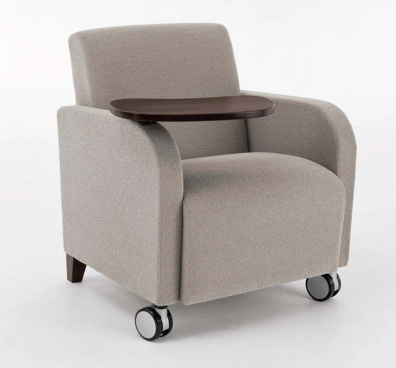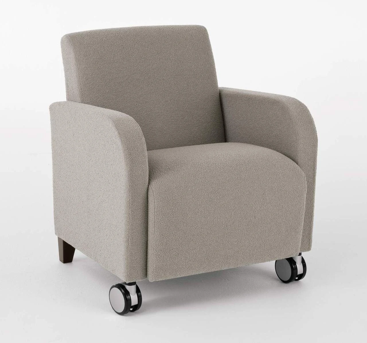 The Siena Guest Chair with Casters by Lesro comes fully upholstered and is built with a heavy duty construction to meet the needs of a high-use reception area. The chair is offered in over 200 different fabrics and vinyls and the back legs can be customized in 9 wood finishes or a brushed stainless steel finish. The two front casters come in black and gray finish only. The chair features the Lesro Matrex seat support system for comfort throughout the life of this chair and rounded arms for additional comfort. The option for a built-in wood swivel tablet exists with this chair, allowing you to add a tablet on either the left or right hand side of the chair. This tablet provides clients a personal table to place belongings or to fill out paperwork while they are comfortably sitting down. This item is shipped in several pieces and is assembled in a few easy steps shown in the assembly guides below. Minimal Assembly Required.