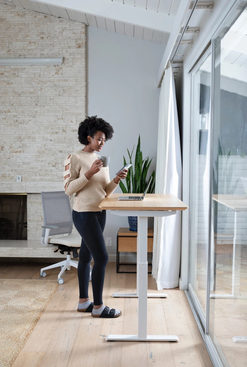 Our new work-from-home Switchback Height Adjustable Desk is exactly what the doctor ordered – for your sore back! Since many of us began to work from home, we’ve noticed that we do less steps and get less travel exercise in everyday! This contributes to more sore necks and backs, as we’re sitting that much more. The studies have shown that sitting too much is bad for our health and now we’re doing even less standing and walking. Add this sit-to-stand electric desk and let your body move more throughout the day, giving you more energy and less pain. This height adjustable office desk is designed to make setting up a beautiful modern looking workspace easy.