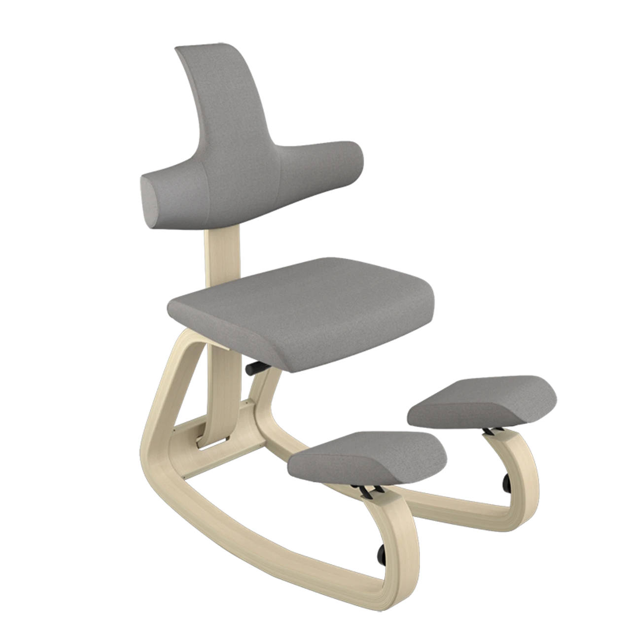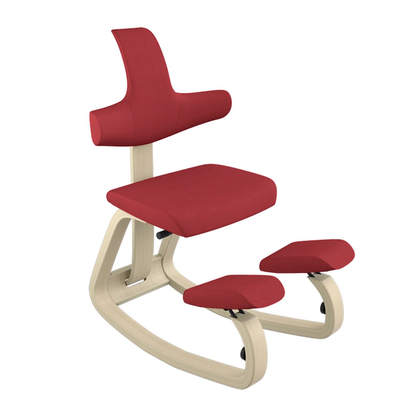 A Varier classic, the seat gently tilts the pelvis forward and encourages a natural, dynamic and upright spine. The muscles in your abdomen and back will engage to keep the spine upright and your body balanced, which further strengthens core muscles and prevents back and shoulder tension. The angle between the upper and lower body increases, which greatly improves your circulation. As the body moves from an active to a relaxed posture, the flexible runners respond with a gentle rocking pendular motion. This ‘active sitting’ chair features a sculpted and supportive height adjustable back. The Mercedes Benz of kneeling chairs.